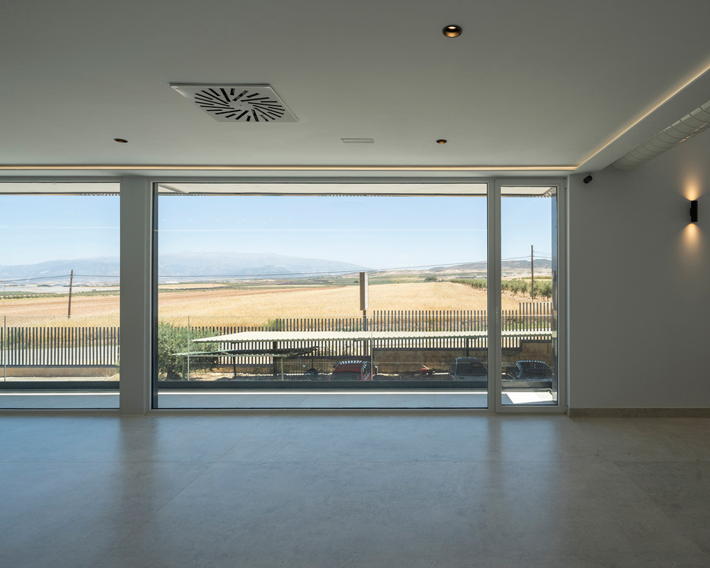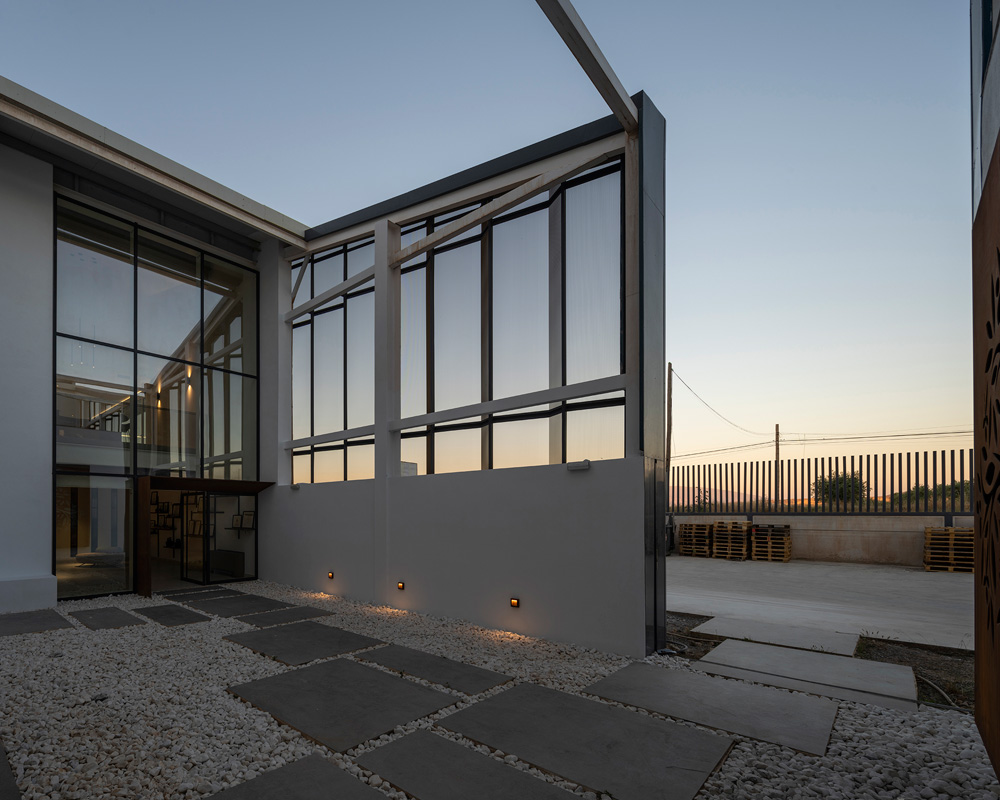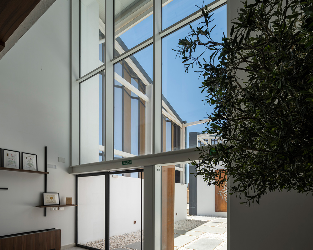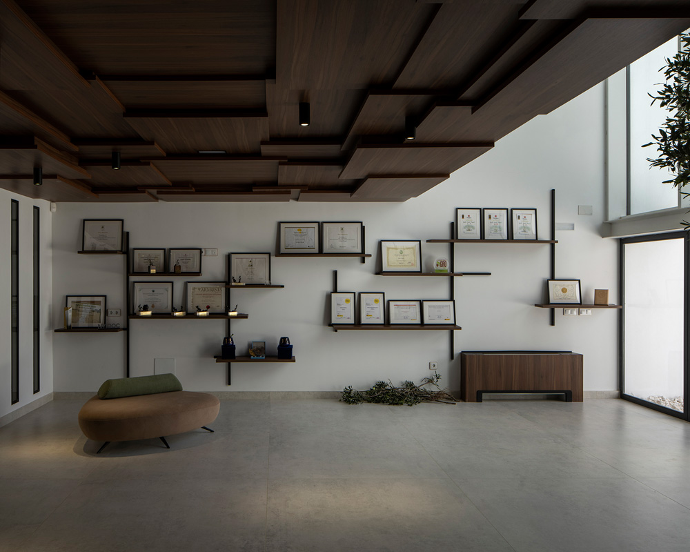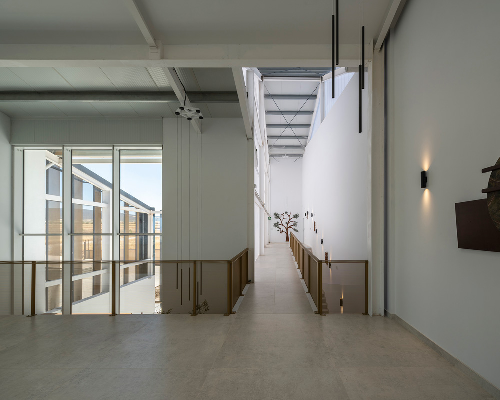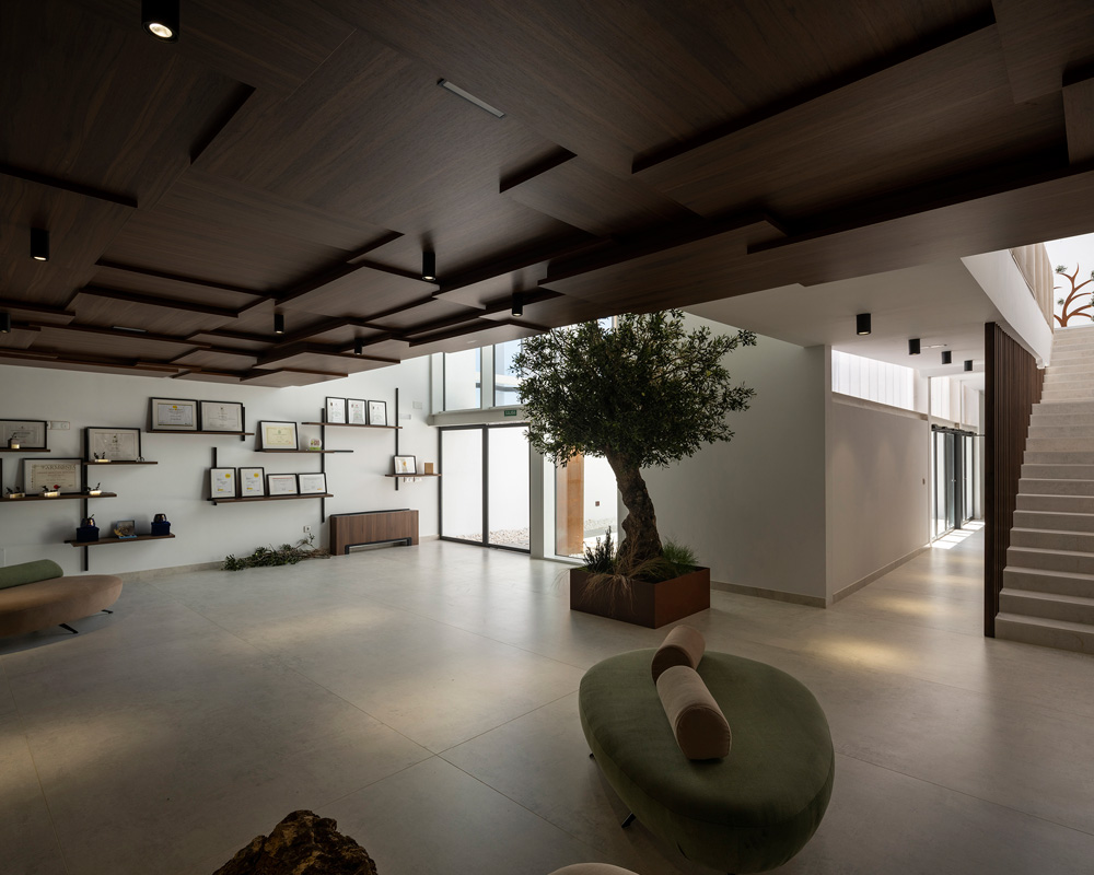 Hinter dieser Hauptfassade befindet sich der Eingangshof, der nicht nur die verschiedenen Gemeinschaftsräume aufteilt, sondern auch dazu beiträgt, jeden Winkel mit einer unglaublichen Helligkeit zu durchtränken. In dieser ersten Halle befinden sich die Büros, die Räume für die Arbeiter, die Versammlungsräume und der Laden, um den Service für die Olivenmühle zu gewährleisten und den Besucher über eine Treppe zu dem Gang zu führen, der die Führungen einleitet.