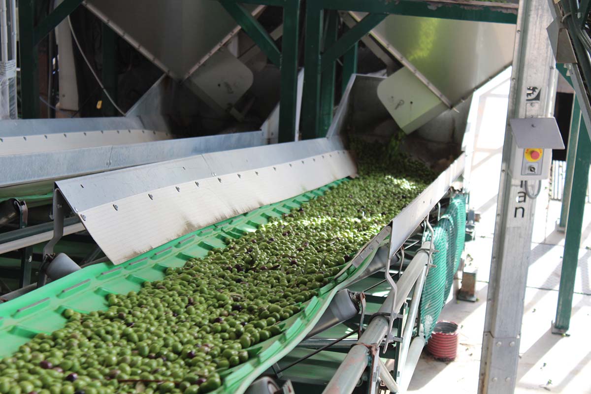 El proceso en la almazara comienza con la limpieza de la aceituna y su defoliación. Es muy importante limpiar bien las aceitunas de hojas y ramas que pudieran haber quedado tras su recogida. Esto se hace en una primera fase mediante el insuflado de aire forzado, y tras esto la aceituna también es lavada con agua.